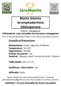 Originaire de Madagascar, cette espèce est proche de G. portentosa, mais plus massive et plus sombre, presque noire. Le corps est robuste, les mâles arborent des “cornes” sur le pronotum, renforçant leur allure dominante. Ils deviennent territoriaux, si surpopulation en espace restreint.